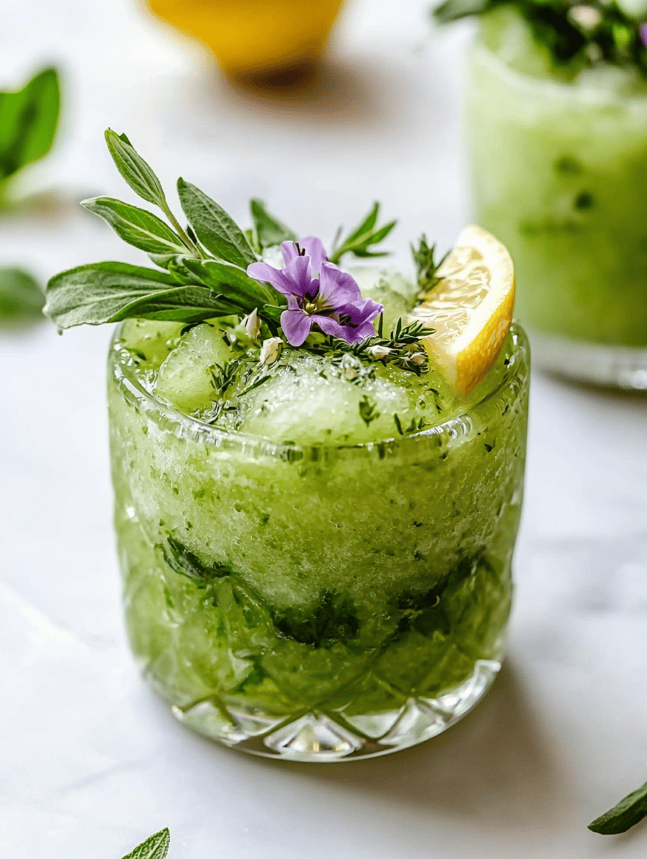 This vodka slushie combines the sharp, icy texture of frozen cocktails with fresh herbs and vibrant flavors. Key ingredients include vodka, fruit, and herbs, blended into a smooth, slushy consistency with a colorful, refreshing appearance. The result is a cold, slightly granular drink that’s perfect for summer moments or celebrations.